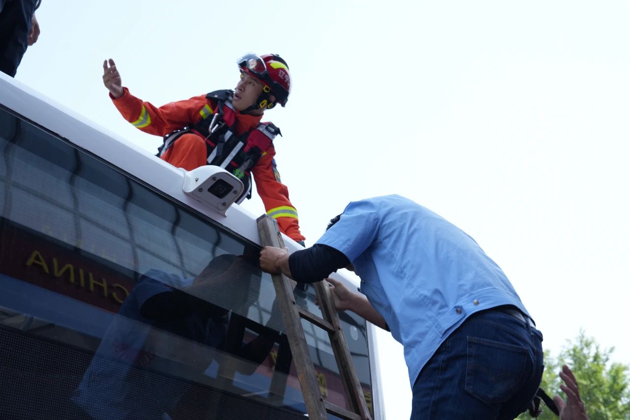 緊隨火情處置,演練模擬強降雨導致路段嚴重積水,一輛公交車被困深水區(qū)。駕駛員迅速組織乘客轉(zhuǎn)移至車廂高位避險,并向公司調(diào)度中心求助。調(diào)度中心通過智能監(jiān)控系統(tǒng)實時鎖定車輛位置,協(xié)調(diào)消防救援力量。救援人員攜帶梯子、水上救生艇等專業(yè)裝備迅速抵達。采用繩索牽引技術(shù)建立安全通道,有序轉(zhuǎn)移乘客,并對特殊群體實施“一對一”精準救助,15分鐘內(nèi)完成全部被困人員安全轉(zhuǎn)移。
