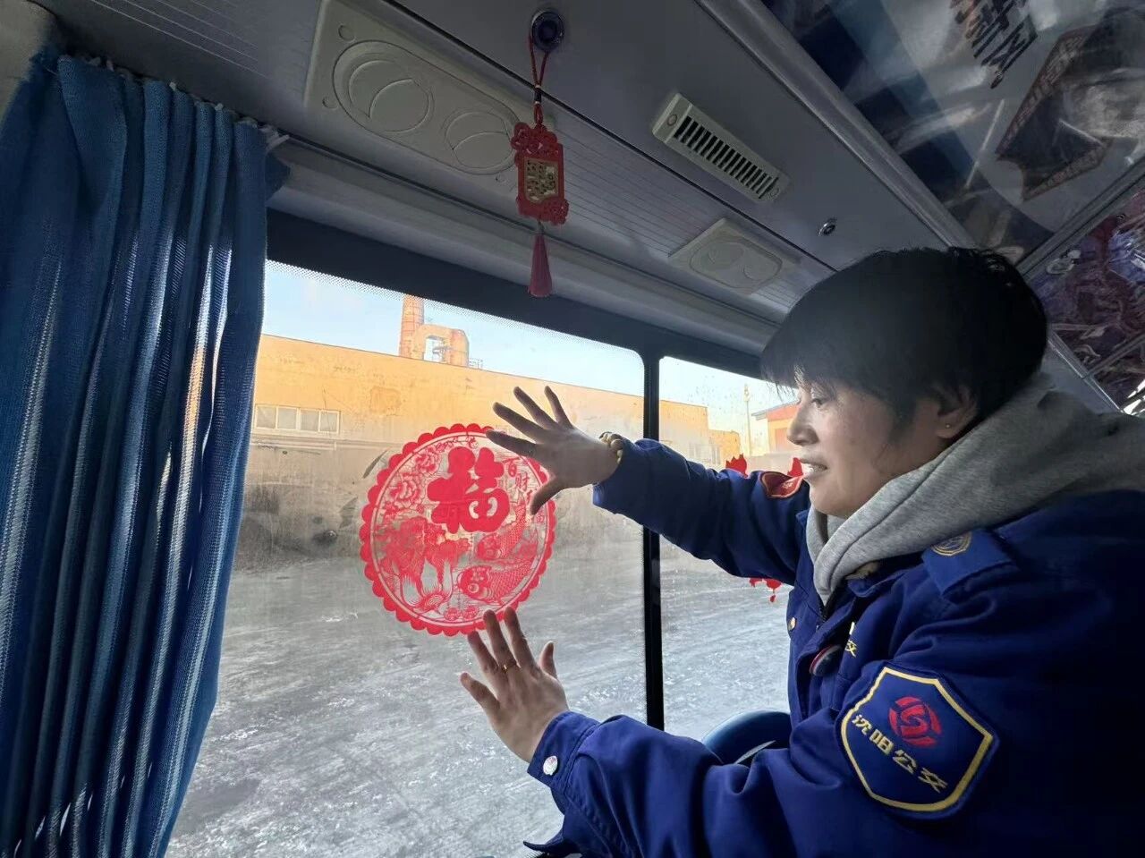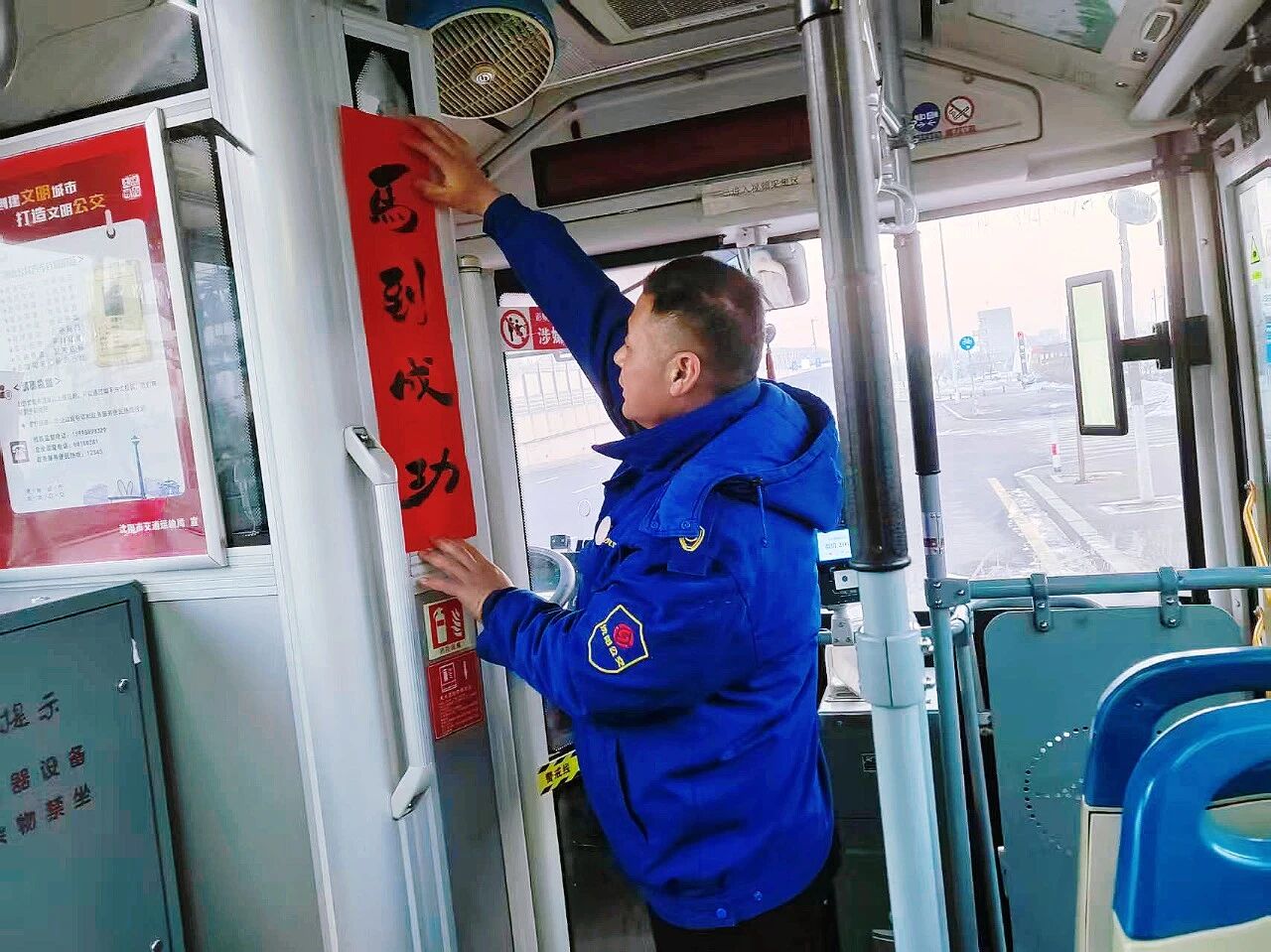 各車隊(duì)還在車廂內(nèi)懸掛紅燈籠、窗花等傳統(tǒng)裝飾。特別是271路駕駛員、書畫愛好者唐德忠揮毫?xí)鴮憽案!弊峙c春聯(lián),筆墨飄香之間,車廂內(nèi)外洋溢著濃濃年味,也傳遞著公交人對(duì)乘客真摯的新春祝福。